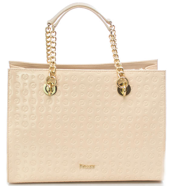 - Halbstarrer Shopper aus glänzendem Polyurethan mit durchgehendem Logo-Print